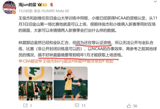 日前,媒体人海Jun的蓝发文称,依照NCAA的办事效率,林葳或最晚要等到明年1月才有上场资格,如果真是如此,这也意味着林葳有差不多4个月的时间,没办法打正式比赛。本来就是亚洲球员出身,且又是第一次去到NCAA,在饮食习惯、语言、生活环境都非常陌生的情况下,这对于林葳而言,确实是一个堪称修罗级别的历练。