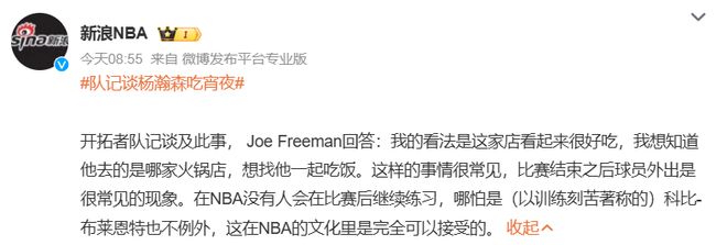 近日,一则关于中国球员杨瀚森在NBA赛后前往火锅店用餐的消息,意外引爆了国内社交网络,部分球迷对其行为表示不满,认为他应当抓紧训练而非外出就餐,这一话题迅速发酵,甚至引来了波特兰开拓者随队记者JoeFreeman的回应,他在接受腾讯新闻专访时坦言:“那家火锅店看起来很好吃,我甚至想找杨瀚森一起吃饭。”轻松的语气背后,是NBA文化中对球员生活常态的理性看待