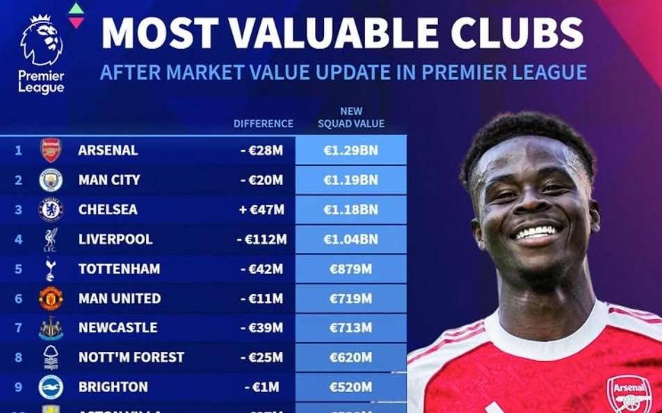 德转英超俱乐部身价排名:阿森纳12.9亿第1、曼城切尔西二三位