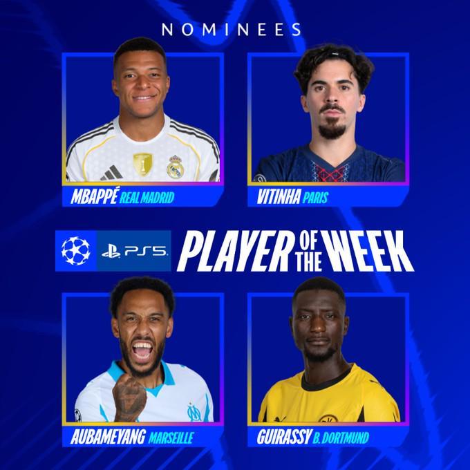 欧冠本轮最佳球员候选:姆巴佩、维蒂尼亚、吉拉西、奥巴梅扬