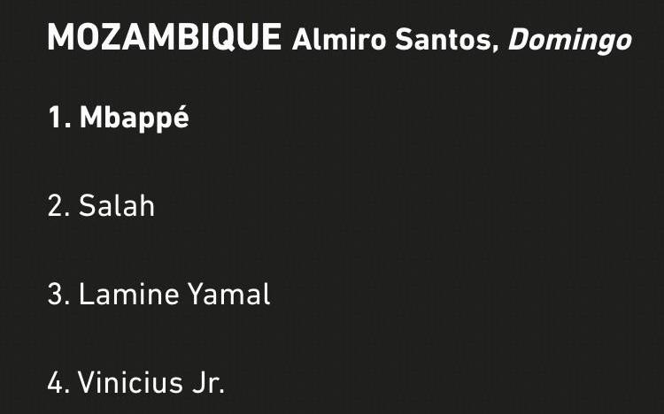 姆总第一顺位,莫桑比克记者投票:维尼修斯第四,登贝莱第五