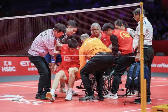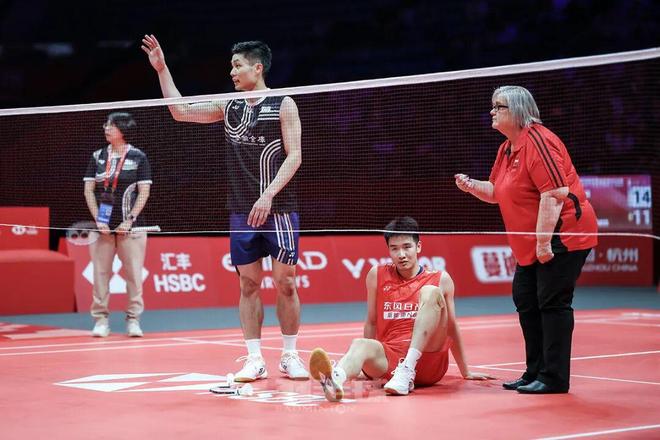 今天上午最后进行的是男单B组李诗沣和周天成的比赛,这场比赛无关出线,是小组第三的争夺。李诗沣在21比14先胜一局、第二局14比11领先时因脚踝受伤弃权,坐轮椅离场。离场时他简短地回应伤情,他表示自己感觉不是太严重,回去要好好冰敷处理并休息一段时间。