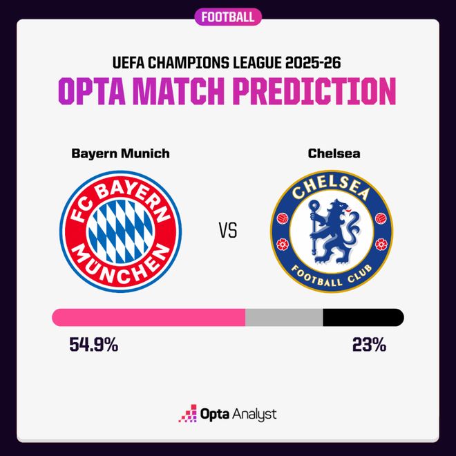 Opta超级计算机的最新预测显示,拜仁慕尼黑在本场对决中占据明显的纸面优势,胜率达到 54.9%。