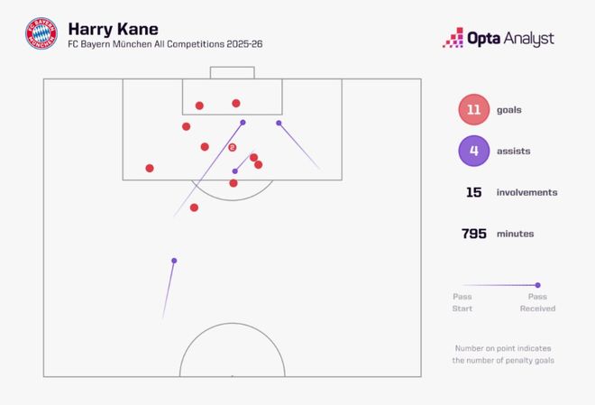 凯恩本赛季状态火热,各项赛事已轰入11球,远超5.3的预期进球(xG),实际进球数几乎翻倍的效率,让他成为拜仁最稳定的终结点。