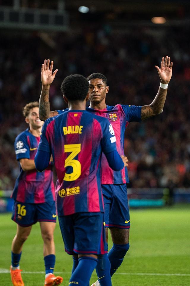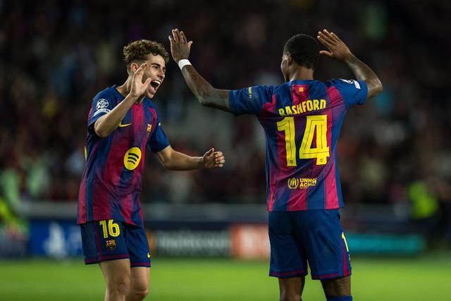 10月21日,巴塞罗那队球员拉什福德(右)和队友庆祝得分。新华社发(胡安·戈萨摄)