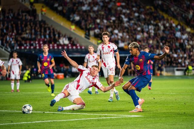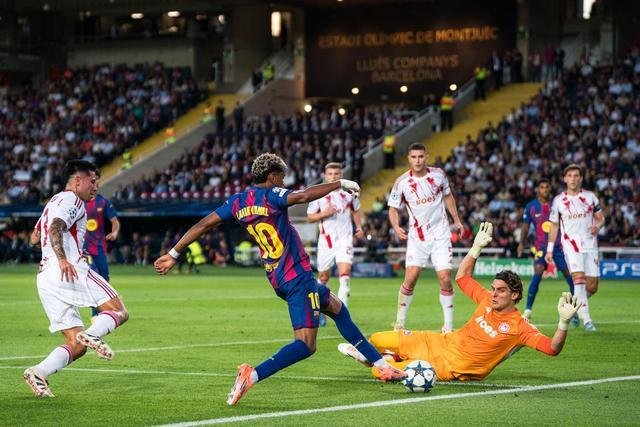 10月21日,巴塞罗那队球员亚马尔(左二)与奥林匹亚科斯队门将佐拉基斯在比赛中拼抢。新华社发(胡安·戈萨摄)