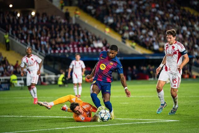 10月21日,巴塞罗那队球员拉什福德(右二)与奥林匹亚科斯队门将佐拉基斯在比赛中拼抢。新华社发(胡安·戈萨摄)