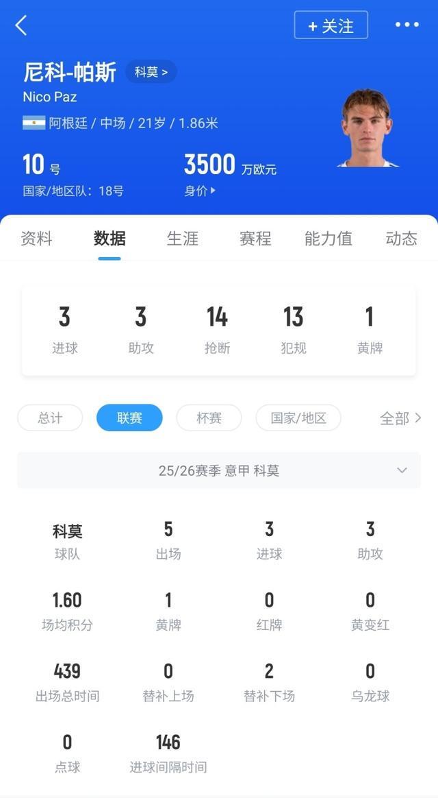 直播吧09月28日宣 意甲第5轮,科莫1-1战平克雷莫内塞,21岁阿根廷中场尼科-帕斯再度破门,新赛季5轮意甲贡献3球3助,包揽全队所有6粒进球。