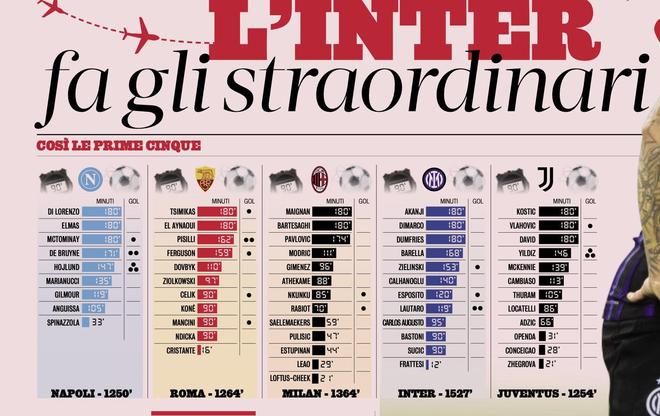 北京时间10月18日,《米兰体育报》统计了意甲目前排名前五的球队各自球员在10月国际比赛日的出场时间,国际米兰以12名球员合计1527分钟排名第一,AC米兰13名球员1364分钟第二。