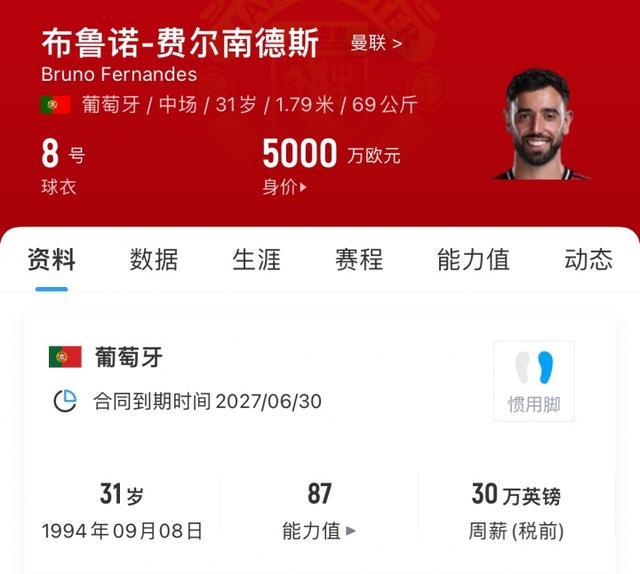 B费现年31岁,他与曼联的合同到2027年到期,他现身价5000万欧,他在曼联的周薪为30万镑。据罗马诺报道,今夏,曾有沙特球队1亿镑报价B费,并提供三倍薪水的合同,但B费选择留队。