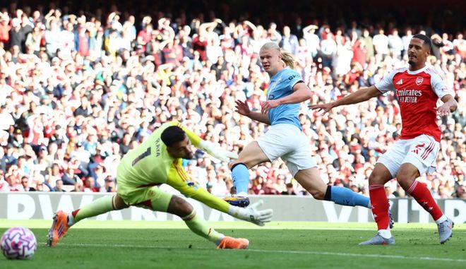 新赛季至今,曼城的战绩不尽如人意。在首轮客场4球大胜狼队之后,瓜迪奥拉的球队先后输给了热刺和布莱顿遭遇2连败。而13名球员伤停,更是让他们在即将到来的9月魔鬼赛程中面临着5连败的风险。然而,哈兰德的挺身而出,让曼城球迷看到了救世主的模样。第4轮曼市德比,他梅开二度率队3球大胜曼联,欧冠对阵老友德布劳内率领的那不勒斯,他在下半场首开纪录,击碎了客队死守1分的美梦。随后客场与阿森纳的强强对话,哈兰德开场9分钟的闪击让曼城先声夺人,如果不是马丁内利伤停补时第3分钟的绝平救主,曼城真的要从酋长球场带回不可思议的3分。