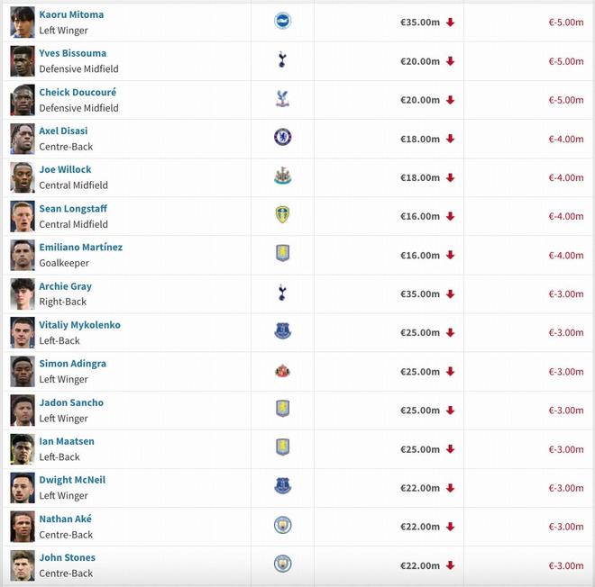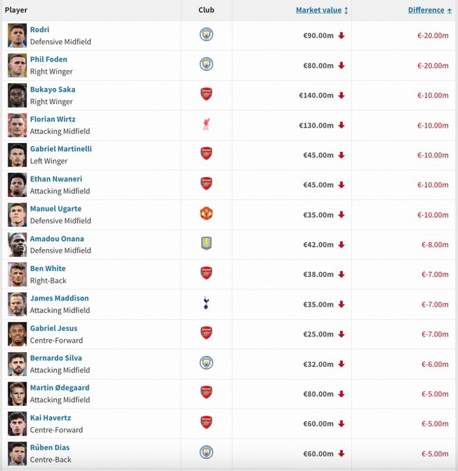 英超身价跌幅榜:罗德里、福登下跌2000万欧,维尔茨、萨卡下降1000万欧