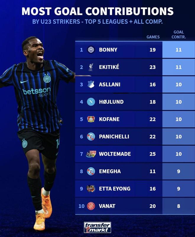 北京时间12月20日,德转列出了本赛季至今欧洲五大联赛U23前锋各项赛事直接参与进球数前10,国际米兰的博尼和利物浦的埃基蒂克同以11球并列第一,霍伊伦、沃尔特马德上榜。