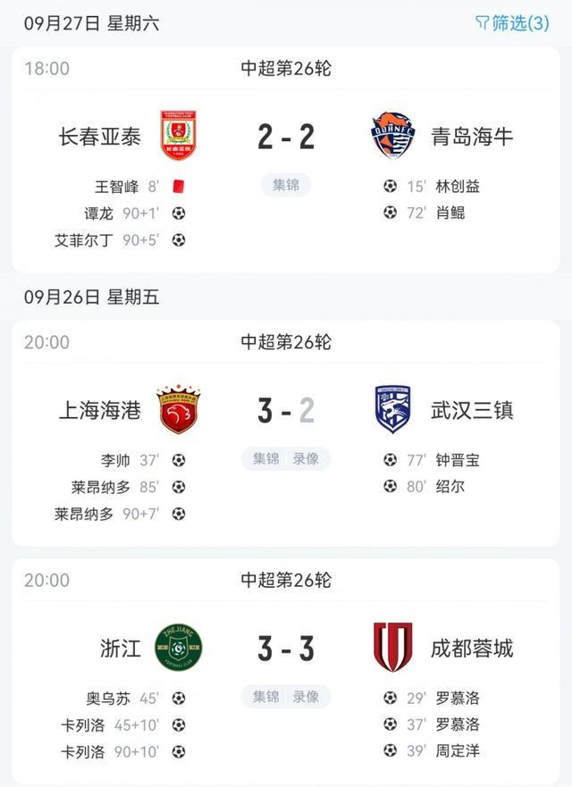 蓉城3-0领先情况下被浙江追成2-3,第100分钟浙江完成绝平